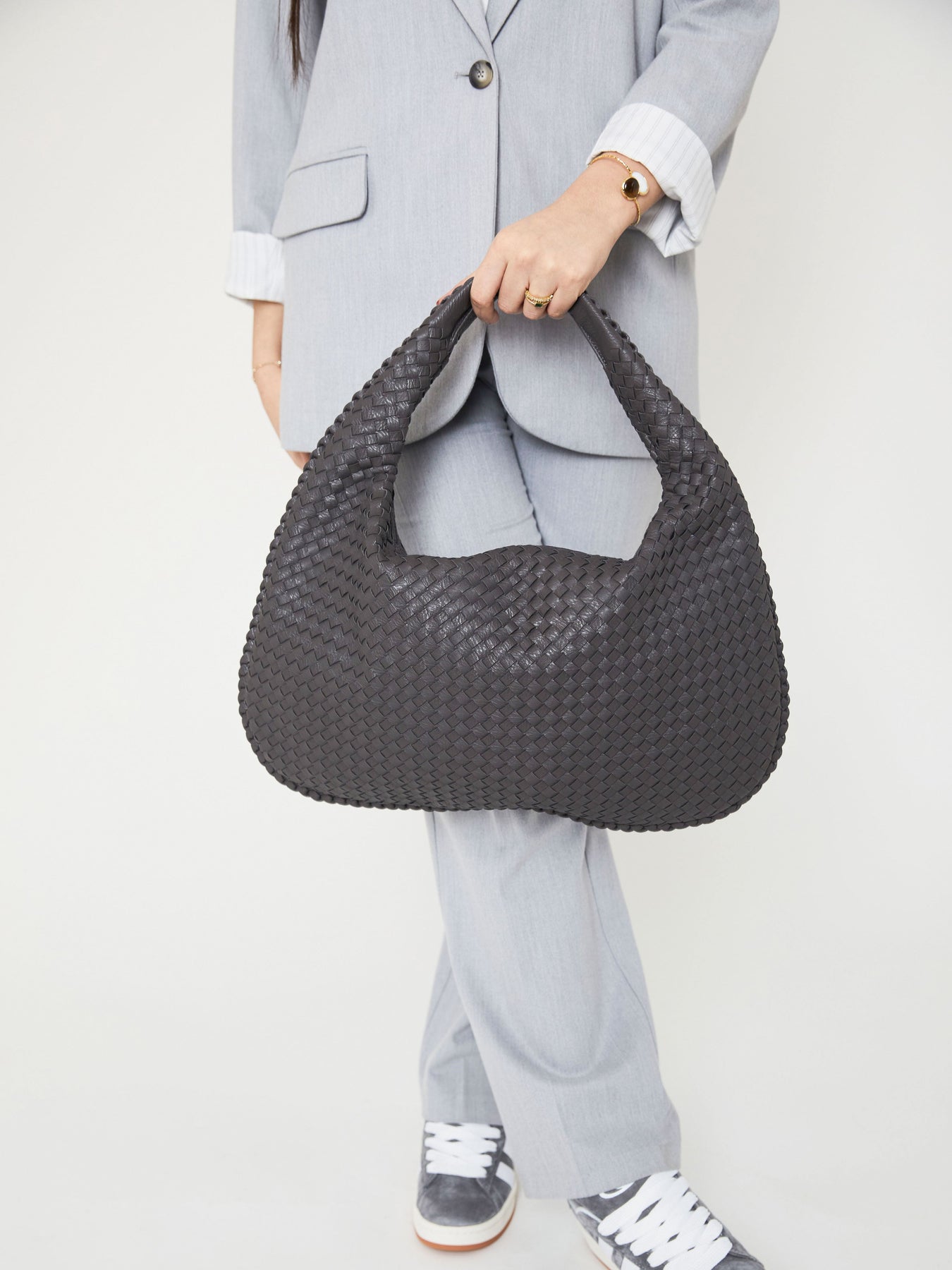 Your new GO-TO everyday bag. Our Everyday shoulder bag has a round shape and a woven/braided design. The bag has a large main compartment with zip closure, and two smaller compartments with zip inside the bag and a small open pocket. The must-have bag is very roomy, and can even fit a MacBook 16" inside.